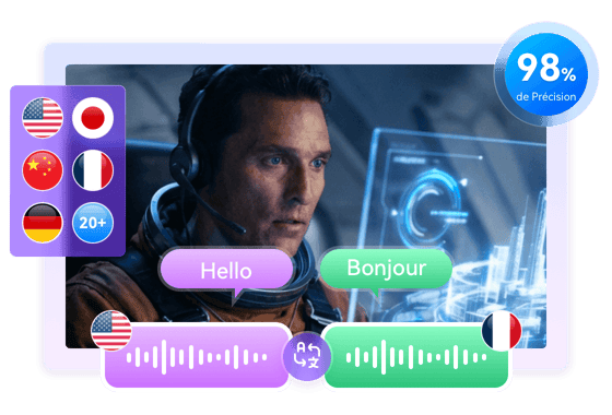 Le moteur avancé de traduction vocale IA de UniFab capture la véritable identité vocale du locuteur — timbre, rythme, émotions et nuances expressives. Il évite le son robotique typique des traducteurs vocaux classiques et offre un doublage qui paraît réellement interprété dans la langue cible. Le résultat est un doublage IA cinématographique et naturel qui préserve la personnalité dans chaque langue.